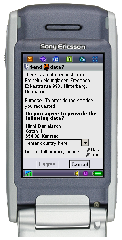 She selects the service “local restaurant finder” to find a nearby restaurant for a business lunch. The service provider gets the pre-selected preferences of Alice concerning the quality (in this case high) and preferred Asian (she likes Asian food and most of her business contacts do as well). The service provider has to know where Alice is located so and asks for the location data.