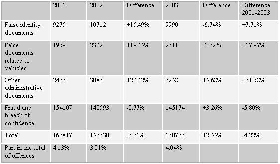 This Report notices an important increase in document fraud over the last few years. The use of false identity documents, for example, appears to have increased by 7,71% between 2001 and 2003, as illustrated by .
