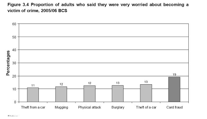 In addition to assessing the percentage of victims and the likelihood of someone falling victim to identity fraud based on age and gender, the BCS also questioned respondents on their fears of falling victim to identity fraud. The findings indicate how more than half (57%) of plastic card users were fairly or very worried of falling victim to card fraud. Hoare and Wood note how that is “a level that is higher than other crime types asked about in the BCS.” This can be observed in Figure 5.1 below.