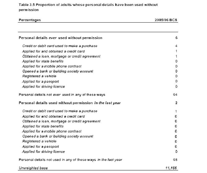 In addition to the data provided and maintained by CIFAS, there is also (limited) survey data available. The Home Office published statistics on plastic card and identity fraud in 2007. These statistics are the findings of the 2005/06 British Crime Survey. The findings on identity fraud provided within the Home Office Statistical Bulletin contain results from the ‘newly-introduced BCS module on this emerging new crime type.’ The authors describe how “Whilst…there are inherent difficulties with obtaining good measures of crimes involving deception, the BCS can provide useful evidence on the experience of such crimes amongst the general population.” The BCS module is also an attempt to increase the knowledge base about identity fraud prevalence. Within the report, it is stated how due to the problems with the accuracy of police records due to lack of reporting and categorization issues (i.e. fraud as deception), “The Home Office, following discussion with the Association of Chief Police Officers and the financial sector, have decided that to reduce the level of bureaucracy involved in fraud recording, and to streamline the reporting and initial investigation of frauds, all cases of economic fraud (involving the use of plastic cards, online banking, or cheques) will be recorded by the financial institution concerned from 1 April 2007. The financial organisations will then be responsible for undertaking further verification and initial investigation, and, as appropriate, reporting cases of criminal activity directly to the police for further investigation.” The survey posed questions to the respondents in a number of categories including plastic card usage. With regard to usage of plastic cards, 83 per cent of all respondents used plastic cards during the previous year. Other findings demonstrate how, “[a]dults living in households in the higher income groups had the highest levels of usage and other variables associated with higher income status reflected this pattern.” Of all the respondents using plastic cards, four per cent became a victim of fraud during the previous year.