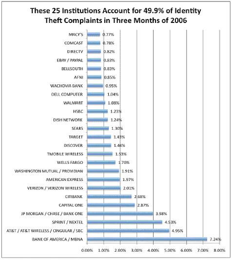 Hoofnagle himself decided to go beyond previous research to gain insight into the differences between companies and the likelihood of their clients falling victim to identity theft. He notes how there has been no previous research into the relative rate of incidents of identity theft among various financial service providers. Hoofnagle acknowledges that “[t]his is a first attempt—a work in process—to meaningfully compare institutions on their performance in avoiding identity theft.” His preliminary results provide a list of 25 institutions within the financial service provider and the telecommunications sector. The Bank of America tops the list with the highest number of complaints and is followed by two telecommunication carriers, AT&T and Sprint/Nextel. indicates the full results.