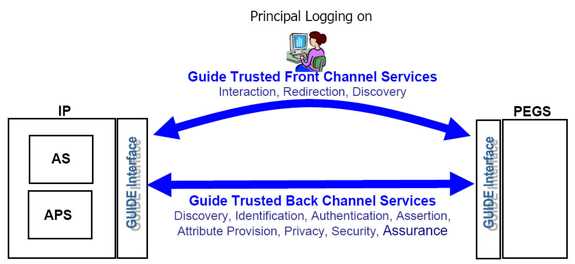 GUIDE uses a federated network identity management approach (Guide 2005). General scenarios taken into account in the GUIDE project are principals logging onto a pan-European Governmental Service (PEGS) in a foreign country. In these cases the PEGS has no possibility to authenticate the foreign user (principal). To do this an Identity Provider (IP) in the home country of the principal is needed. This IP provides in general two basic services: