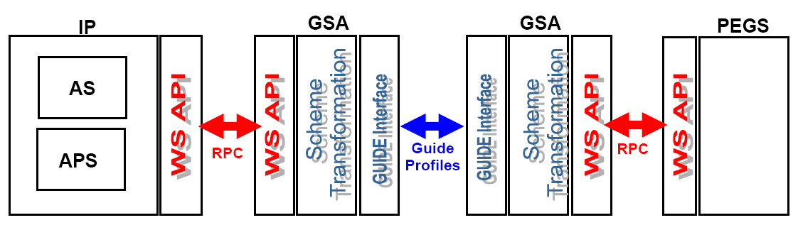 To overcome this situation GUIDE proposes the introduction of Gateways equipped with the GUIDE Software Agent (GSA). This agent transforms data formats and standards used by PEGS and IPs (in this example a remote procedure call (RPC) able web service application programming interface (WS API)) into an intermediary GUIDE profile as shown in the following figure: