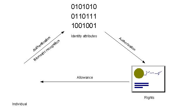 Proportionality means in practice that a biometric application is used to link the biometric sample with the necessary and sufficient attributes of the identity of an individual to allocate the rights or authorisations that the specific individual is entitled to in the application context. The term of proportionality can be explained in the triangle of a value transaction between two parties (see Figure 12). The requesting party undergoes an authentication process (e.g. biometric recognition), that identifies the identity attributes necessary and sufficient to define his rights in the context of the transaction. This enables the delivering party to give the requested allowance to the rights requesting party. Proportionality means that the allowance delivering party collects only the necessary and sufficient identity attributes to correctly define the rights of the allowance requesting party. It especially means that biometric recognition should not be used for any other purposes than for the specific application within which the individual delivered his biometric sample data. Any evaluation of biometric data outside the context of the immediate application potentially violates the request for proportionality. It is clear that the proportionality issue is a crucial point in any identification process that does not have the full approval of the individuals involved. Such an involuntary identification may violate the proportionality criterion. However, there are applications, especially in the context of fraud and forensics where individuals are not cooperative, where the notion of proportionality has to be extended to the basic purpose of the identification process. It is possibly not a violation of proportionality if passengers of an airline are screened against templates of known terrorists as long as the biometric data of the screening are not used for other purposes and there is a legal basis for this practice.