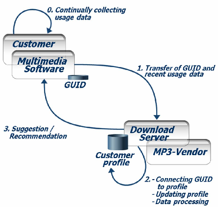 To illustrate how a privacy-compliant usage of GUIDs could be achieved, we’ll take a look at some imaginary multimedia software that can play MP3 files. Therefore we assume that the vendor of the software provides a service to suggest commercial MP3 downloads based on the user’s preferences. Playback of the MP3 files is done locally. The software gathers information about what is played, what is skipped and when playback is started and stopped. This leads to a user profile saved on the local machine. Whenever the user visits the vendor’s website to download MP3 files, the stored usage profile is needed for recommending songs. The service provider specifies which specific data are needed, e.g., songs played and songs skipped, but not the postal address or the real name.
