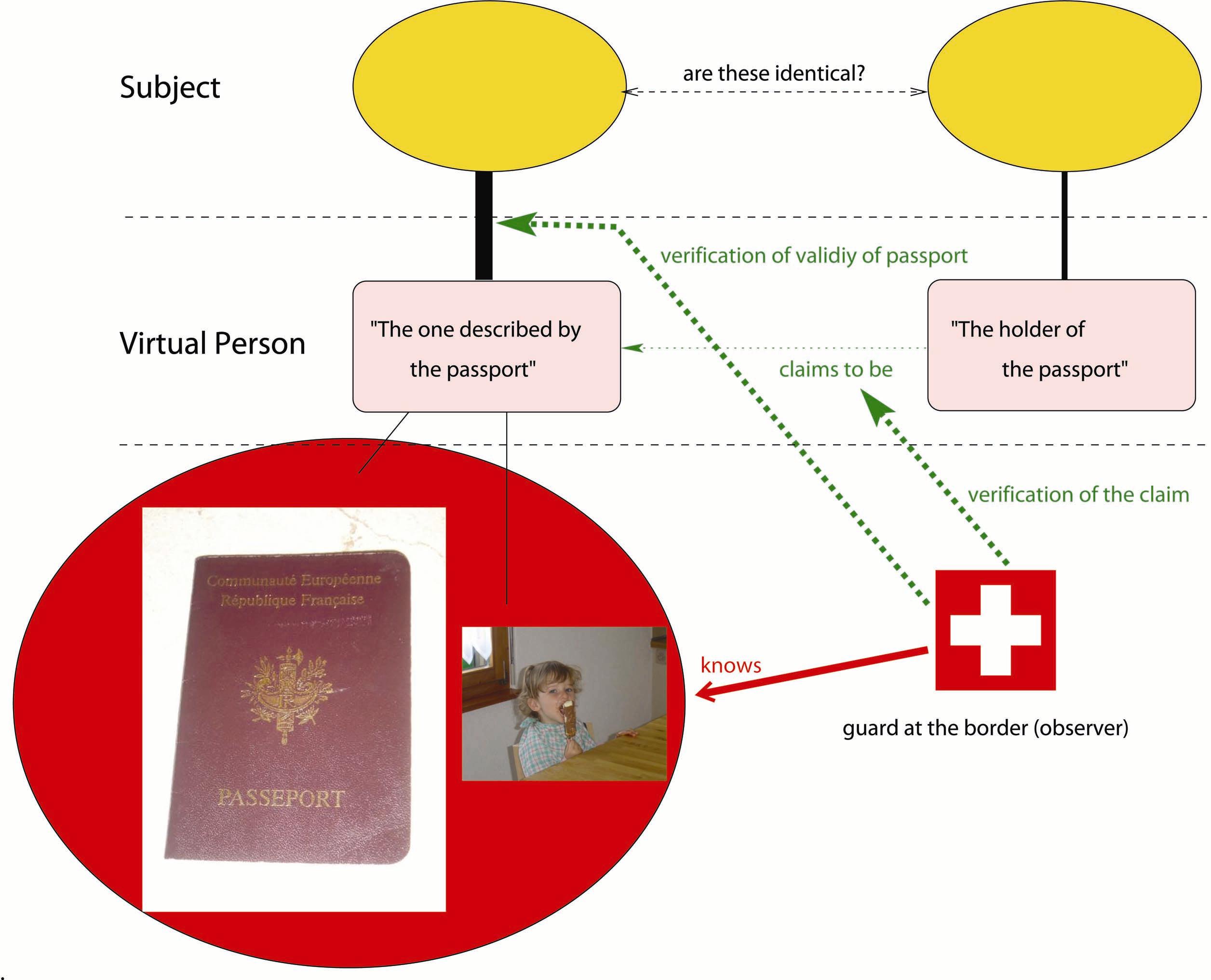 Border ControlConsider the situation where you stand in front of a guard at a border, cf. Fig. 6. Usually the guard will ask you to show your passport in order to “check your identity”. More precisely, here again, several entities interact: the guard at the border acting as the observer, the virtual person “The one described by the passport” and the virtual person “The holder of the passport”.