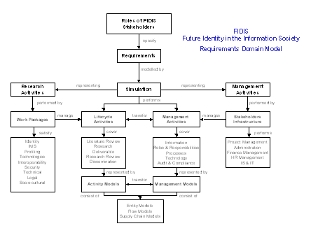 A typical entity model of the requirements domain, for the FIDIS project, is shown in Figure 3. It should be a representation of identity management that will satisfy the requirements criteria for all aspects of the project, of which the information resource is a part.  It will include a contextual description of the purpose of identity management within an institution. The requirements should specify what information is needed throughout the lifecycle of research and its application to the development, delivery and dissemination of FIDIS results. The requirements should specify where, when and how the information is to be delivered to all stakeholders.