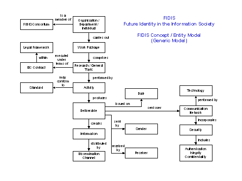Entity models specify the relationships between such entities as people, objects, processes, and information within and between institutions. They are used to brainstorm, or when working from a fresh start, to specify and resolve business issues and to define the related corporate information. An entity model for information management within FIDIS is shown in Figure 4. It is a generic model, which may be applied by each Work Package.