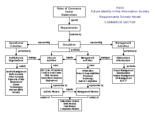 A stakeholder model for e-Commerce is shown in Figure 9 which represents a “typical” structure of a commercial sector. All types of information, documents, products and currencies flow, within and between organisations and customers, throughout supply chains within the commercial sector