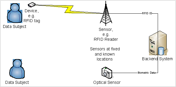 1. Static sensors and mobile devices or objects bearing or transmitting location information; in this case the location information is given by the position of the identifiable sensor and can be interpreted using, e.g., reference databases (cf. ), and