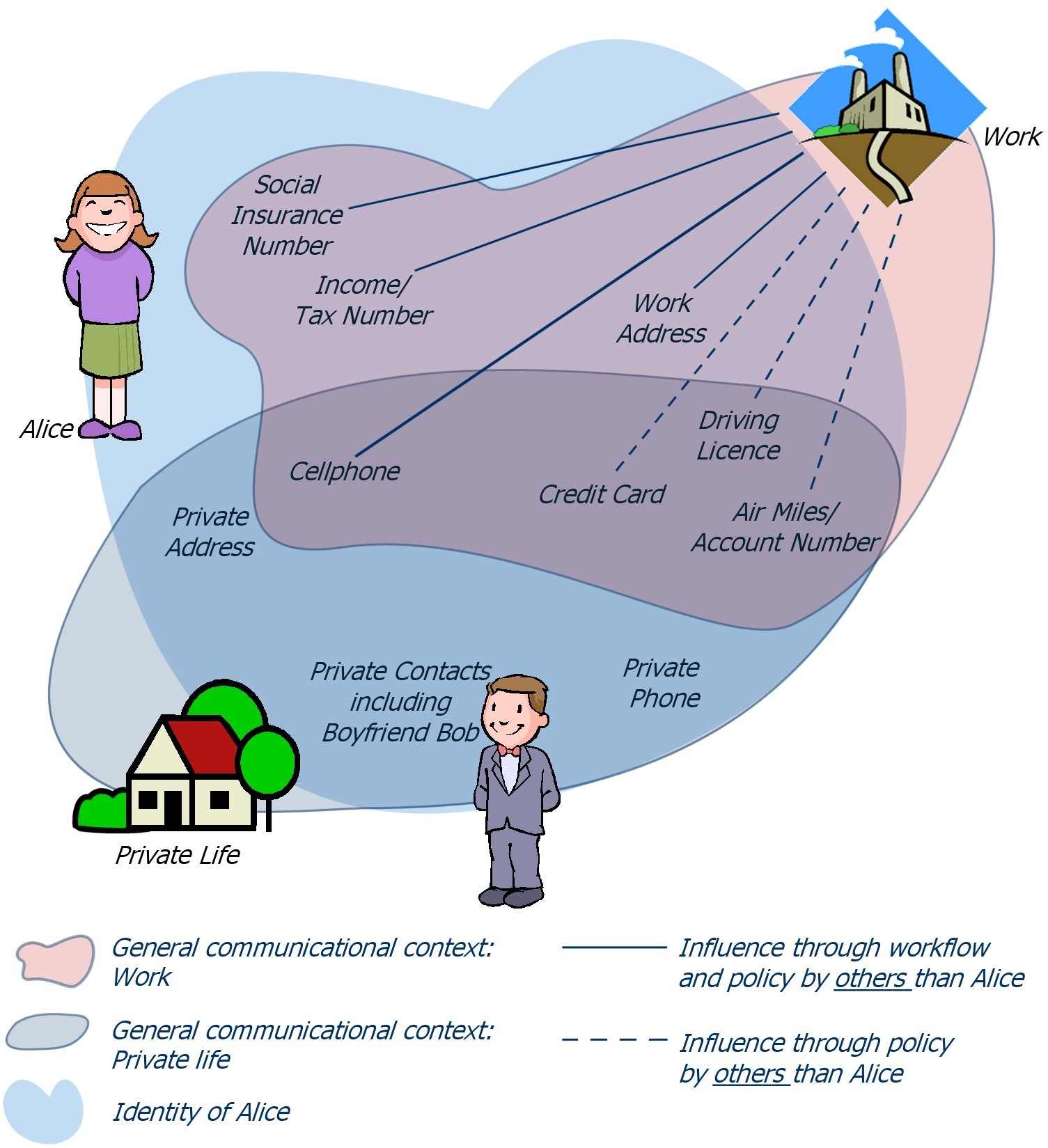 In addition, the combined professional and private data under control of her employer may be attractive for identity thieves. If the security of the central server (where data in this scenario is not encrypted) is insufficient and data from Alice is stolen, potentially severe trouble for Alice in both her professional as well as her private life may result, e.g. by abusing her data for stalking or fraud. In addition to the need to revoke and change (partial) identities, personal communicational contexts - for example with customers or friends - often suffer as well. Restoration of these communicational contexts, damaged by identity fraud, may need time and may cause additional costs. In contrast to scenario 2 this may be more harmful because private communicational contexts are affected as well.
