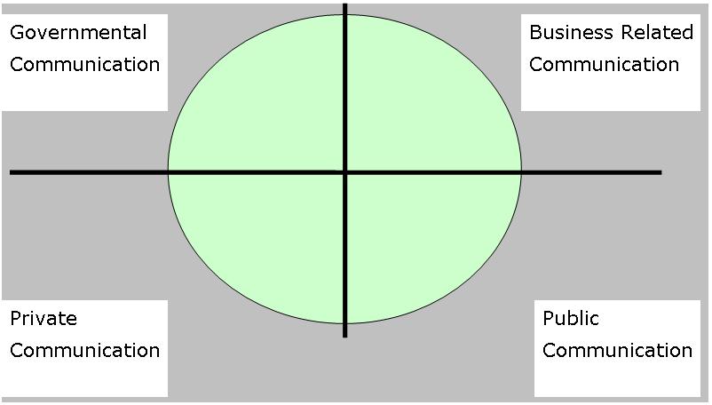 The public sector, this sector has a different nature as compared to the other sectors. At least one participant of the communication aims at many partners (1:n communication) in a public way. Examples for this kind of communication are public parts of online-shops, postings in open web fora, portals, newsletters, scientific online articles, etc. In addition the information published typically is not confidential. The publisher at the moment of publishing does not know exactly which role and in which social system the recipient of the communication will take.
