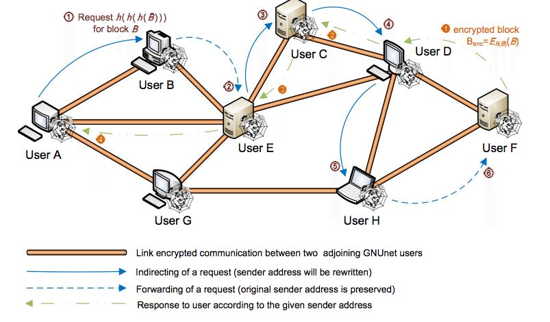 It is up to each user to decide how many and which other users will receive a request which is going to be rerouted. The amount of forwarded messages is determined by the current CPU and network loads, the reputation of the sender, and a random value. In that case, reputation of a user is determined by the amount of her requests and valid answers, in short her behaviour. Additionally, each request provides a field, which determines the time-to-live that is particularly useful to avoid that requests circulate forever in the GNUnet.